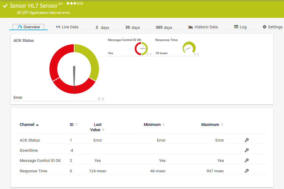 The HL7 sensor monitors the availability of HL7 interfaces. It sends an HL7 message to the target device and checks for a valid response.